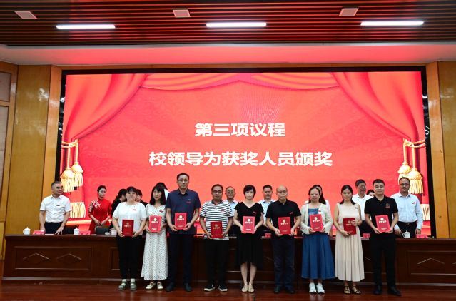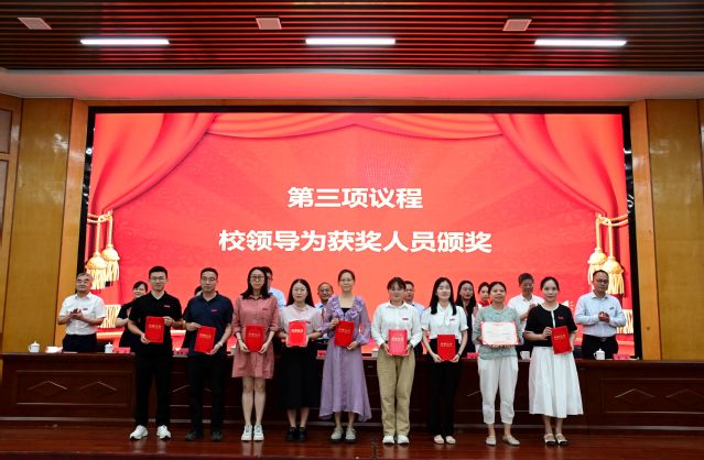 校党委委员、副校长余新卫宣读表彰决定,对获得2024~2025学年度优秀教师及先进教育工作者、教学管理先进个人、科研工作先进个人、学生管理先进个人、优秀辅导员、教学之星、科研之星、服务之星、最美辅导员等荣誉称号的教师进行表彰,校领导为获奖代表和教龄满35周年的教职工代表颁发荣誉证书。