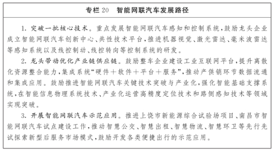 发展重点。以南昌、上饶、景德镇、抚州、宜春等为重点,引导企业前瞻布局关键技术,支持整车企业与互联网、人工智能、信息通信等企业深度合作。鼓励开展复杂系统体系架构、复杂环境感知、智能决策控制、人机交互及人机共驾、车路交互、网络安全等基础前瞻技术研发,推进车载高精度传感器、车规级芯片、智能操作系统、车载智能终端、智能计算平台等产品研发与产业化。加强数据互联互通和智能化基础设施建设,支持建设智能网联汽车仿真测试平台。探索示范应用模式,建设智能网联汽车测试区与智慧交通应用示范区,开展智能网联汽车在物流、公共交通、环卫等场景应用示范。