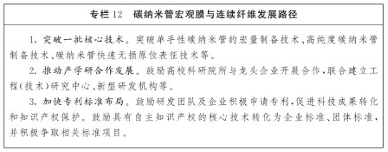 发展方向。发挥我省技术研发优势,深化政产学研用金深度融合,促进科技成果就地转化,重点发展碳纳米管宏观连续体及以此为基础的先进碳纳米复合功能膜、防辐射材料、电磁屏蔽材料等。