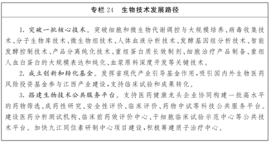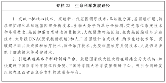 发展方向。依托中国(南昌)中医药科创城、中国(赣州)青峰药谷等载体,布局建设国家高等级生物安全实验室,加快基础生物技术和突破性关键技术研究,提升研发能力和生产制备技术水平,引导生物医药、生物医学工程、生物制造和现代化养殖等领域高质量发展。