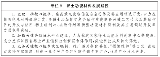 发展方向。充分发挥中科院赣江创新研究院、国家稀土功能材料创新中心等优势,发展高性能稀土磁性材料、高丰度稀土永磁材料、高矫顽力低重稀土永磁材料、稀土储氢材料、稀土发光材料、稀土尾气净化催化剂及器件、稀土激光晶体材料、稀土合金材料及零部件、稀土永磁电机、高端稀土陶瓷等,建设世界级中重稀土新材料及应用研发生产基地。