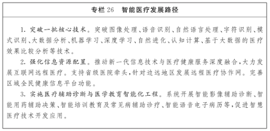 发展重点。以南昌、上饶等为重点,发展智能诊断、智能治疗、智能养老、智能健康服务等新业态、新模式。鼓励发展“互联网+健康”,推进互联网医院建设。突破医学自然语言处理、文档语义识别等技术,发展智能辅助诊断系统。推进智能影像识别、病理分析、辅助诊疗、中医辨证论治等的研发和示范应用。构建数字病人,模拟患者沟通、手术解剖等医疗场景,推进AR/VR、计算机可视化等技术在治疗规划、外科手术、微创介入、活检穿刺等环节的应用。全面推进“智慧医院”建设。
