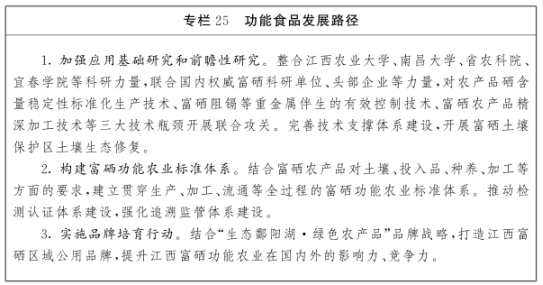 发展重点。以萍乡、赣州、宜春、上饶和吉安市等为重点,加快发展富硒稻米、富硒水果、富硒蔬菜(竹笋)、富硒油菜、富硒茶叶、富硒禽蛋等产业。大力发展运动营养食品、老年食品、特殊人群专用健康食品、特殊医学用途配方食品、中药功能食品和功能性益生菌制剂、发酵剂等功能性食品。依托现代农业产业园、加工园和物流中心,构建“硒+农业、物流、物联网”的线上、线下服务体系,建设全国知名富硒产品交易中心、区域大数据智慧物流中心。鼓励高等学校、科研院所、龙头企业加强合作,建设一批产学研、农科教紧密结合的富硒功能农业园区。