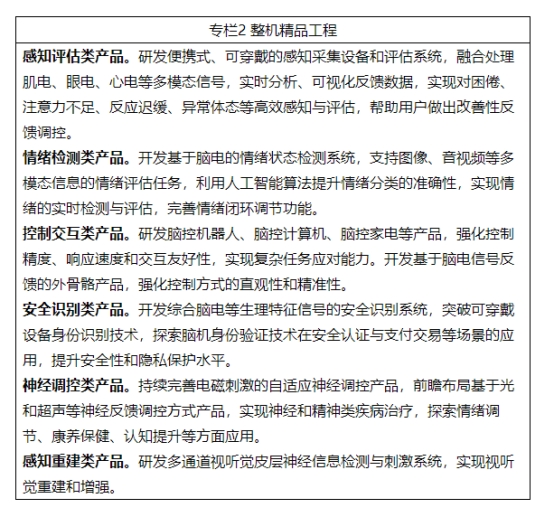 (六)发展辅助设备。研发辅助生理信号设备,通过脑信号与肌电、眼电、心电、近红外等多模态信号的融合,提升交互控制和感知觉评估的精准度。研发用于植入脑机接口的高精度手术机器人,突破亚微米级精度控制与动态调整技术,提升区域精准实时成像与三维重建能力。