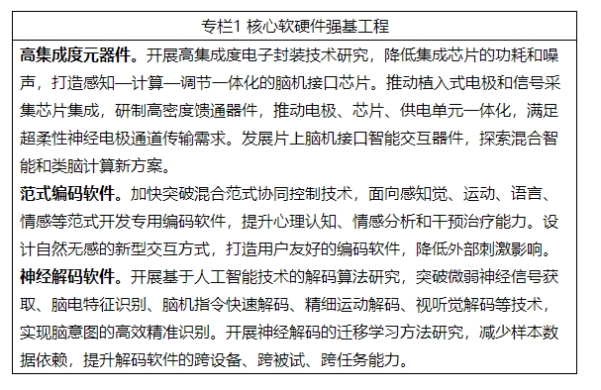 (二)突破关键脑机芯片。发展高通道、高速率脑信号采集芯片,强化模数转换、通道管理和噪声抑制,增强脑信号采集放大能力。研发高性能、超低功耗脑信号处理芯片,强化并行处理能力,推动感知、计算和调节等功能的一体化集成。研发超低功耗、高速率、高可靠的通信芯片,提升脑信号传输和抗干扰能力。