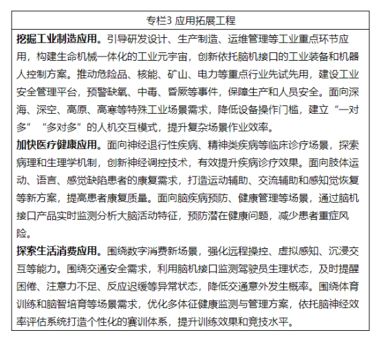 到2027年,脑机接口关键技术取得突破,初步建立先进的技术体系、产业体系和标准体系。电极、芯片和整机产品性能达到国际先进水平,脑机接口产品在工业制造、医疗健康、生活消费等加快应用。产业规模不断壮大,打造2至3个产业发展集聚区,开拓一批新场景、新模式、新业态。