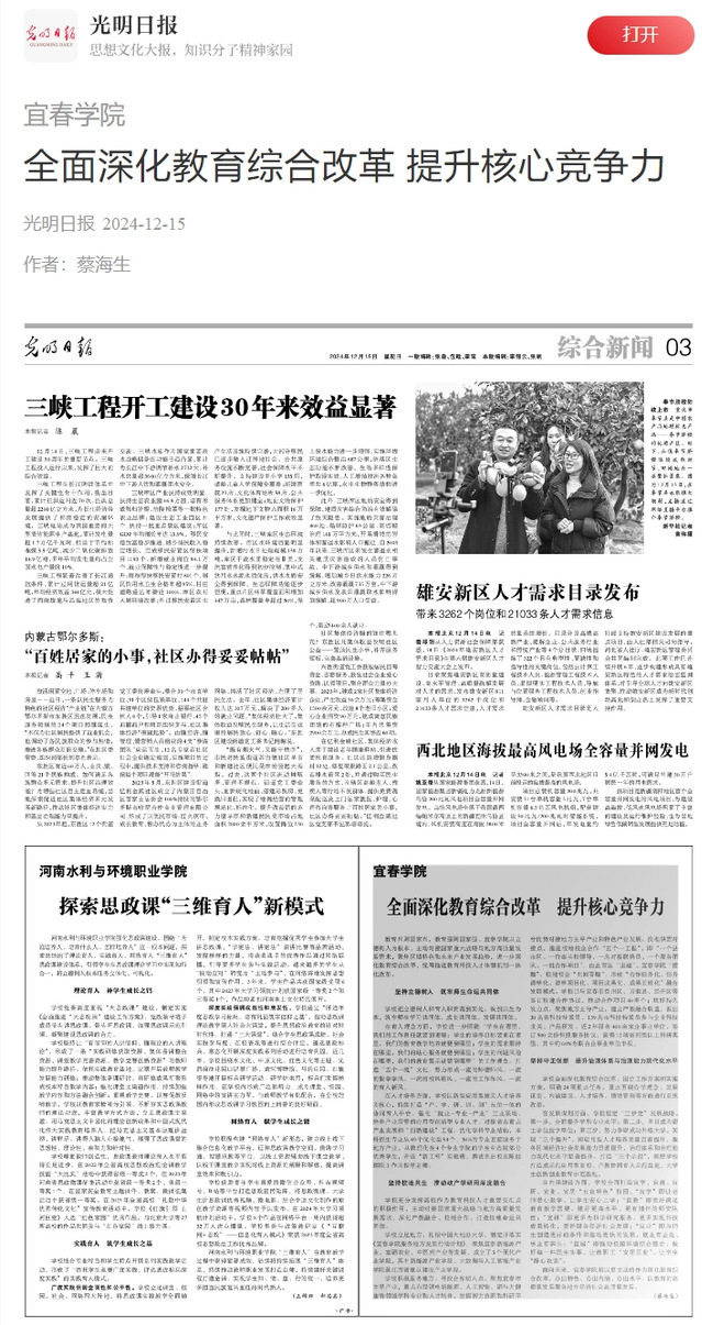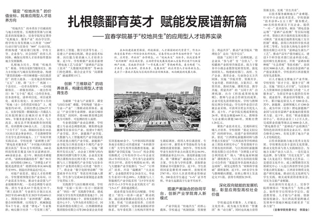 全面构建“大思政”格局,推进“问题式专题化团队教学改革”,获批省级思政教学项目,思政工作案例获全省一等奖,相关育人经验被《中国教育报》宣传报道。严格落实意识形态工作责任制,阵地管理规范有序。出台“三全育人”方案,推进五育融合,成立宜春市家庭教育(心理健康教育)指导中心,升级“一站式”学生社区。学生竞赛斩获省级以上奖项1205项,其中国家级一等奖35项,2025届毕业生毕业去向落实率84.97%,考研录取800人再创历史新高。本科教育教学审核评估获专家高度评价,办学成效位居全省地方应用型高校先进行列。